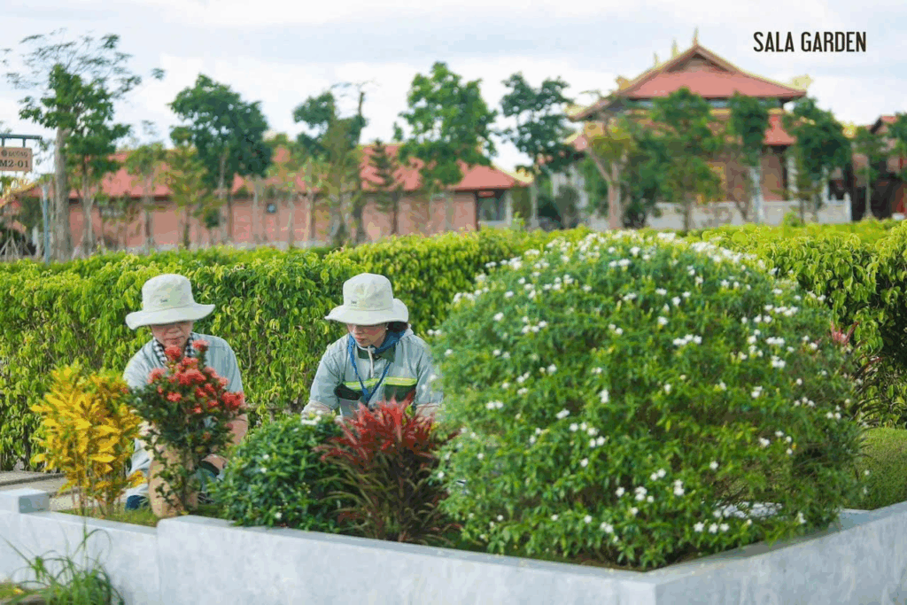 Ở Sala Garden, chăm sóc cảnh quan không chỉ là công việc, mà còn là một phần của tâm nguyện gìn giữ sự bình yên cho không gian Sala. Mỗi ngày, đội ngũ kỹ thuật và nhân viên chăm sóc cảnh quan đều bắt đầu công việc từ rất sớm: kiểm tra độ ẩm của đất, tưới nước, cắt tỉa, thu dọn lá khô, trồng hoa theo mùa, và chăm bón từng thảm cỏ để luôn xanh mướt quanh năm.